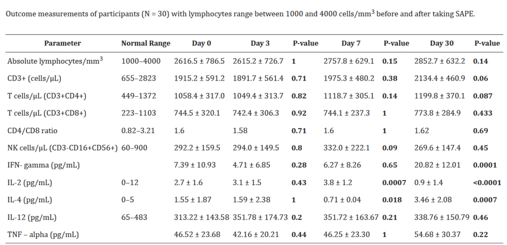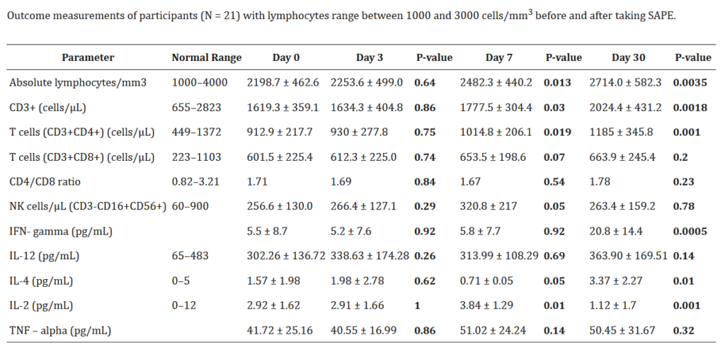 Dalam penelitian ini mengungkapkan bahwa suplementasi Ekstrak Sambiloto dapat meningkatkan respons imun adaptif yang terbukti dari peningkatan total limfosit, sel T, sel pembantu CD4 + T, dan sitokin seperti IFN-γ, IL-4 dan penurunan IL-2 , tanpa menyebabjab efek samping yang signifikan.